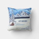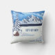Un coussin décoratif avec une belle scène hivernale comprenant des montagnes enneigées, une cabane rustique et des conifères couverts de neige. L'image, le texte et l'arrière-plan peuvent être personnalisés. Vous avez également la possibilité de supprimer le texte. Œuvre originale de W.B.