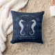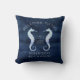 "Seahorse Beach Navy Blue Rustic Watercolor Wood et Arabesque Motif Jeter l'oreiller." Aquarelle bleu marine riche en bois peint arrière - plan rustique est jumelé avec des hippocampes peints à la main, remplis d'une motif en bois arabesque et de votre nom de famille, de votre message, de vos coordonnées (latitude et longitude) ainsi que du nom du lieu pour un cadeau unique et personnalisé. Art par Audrey Jeanne Roberts, artiste et designer de renommée internationale, copyright.