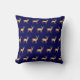 Motif de silhouette de rennes dorés sur coussin bleu marine.