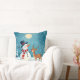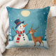 Un joyeux bonhomme de neige avec une écharpe rouge et un sympathique renne se tient au milieu des arbres enneigés et des flocons de neige qui tombent, illuminé par une lune hivernale brillante. Une scène festive évoquant la chaleur et la joie.