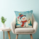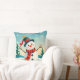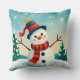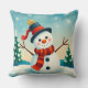 Un bonhomme de neige coloré avec un foulard et un casquette au milieu des arbres enneigés sous un ciel serein.