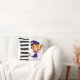 Un coussin avec une mignonne sorcière portant un grand casquette de sorcières violettes. Sa chatte noire se reposant sur le dessus de sa tête. Elle a de longs cheveux orange et porte un balai. Belle illustration de dessin animé parfaite pour l'halloween. La bordure gauche a des rayures noires et blanches.