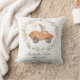 This adorable throw pillow features a cute bunny riding a carrot car framed with lush wildflower wreath.