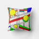 Cet oreiller de lancer a un design moderne du milieu du siècle d'un look de vitrail avec des lignes noires et des cercles remplis de couleurs primaires et secondaires.