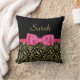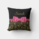 Un élégant carré damassé noir et or à fleurs jette l'oreiller avec un arc chic en satin rose chaud. Personnalisez ce design élégant en ajoutant votre nom. Image imprimée plate, non métallique ou réelle arc.