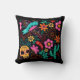 coussin décoratif coloré au design mexicain avec poivrons, cactus, crâne, oiseaux, fleurs sur un arrière - plan noir.