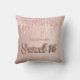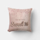 Un coussin pour une chambre pour filles de 16ème ans. Un arrière - plan d'or faux rose avec de l'or faux rose et des gouttes de parties scintillant rose, la peinture goutte à goutte. Le texte : Sweet 16 est écrit avec une police de style ballon, script. Personnalisez et ajoutez un nom.