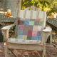 Décor rustique patchwork dans les tons bleu clair, rouge, vert, blanc et gris pour maison de campagne et terrasse.