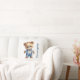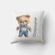 Un adorable ours en peluche mignon et habillé en tenue bleue sur cet oreiller à jetons pour bébé en pépinière. Personnalisez-le avec le nom du bébé ou tout texte.