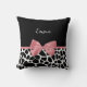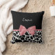 Un carré à imprimé girafe noir et blanc branché lance l'oreiller avec un ruban rose girly attaché dans un joli arc. Personnalisez cet élégant design poster de animal en ajoutant votre nom. Le côté inverse a un motif de girafe noir et blanc. Image imprimée plate, pas l'arc réel.