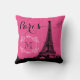 Ce coussin rose vif et chic présente une image de la Tour Eiffel noire avec "Paris" en écriture moderne. Un monogramme initial pour vous de personnaliser est encadré par un parchemin blanc fantaisiste. Arrière - plan est un faux burlap texture en rose vif.