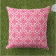 Un oreiller extérieur lumineux présentant un motif de treillis quatrefeuille blanc sur un fond rose joyeux. Le design en treillis d'inspiration marocaine ajoute un style géométrique ludique aux sièges de patio, à la détente au bord de la piscine ou aux meubles de jardin. Un accent amusant et féminin pour les espaces extérieurs qui aiment une touche de couleur heureuse.