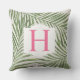 Un coussin tropical comportant des feuilles de palmier vert sur un fond beige lin avec un monogramme initial rose vif personnalisable dans un cadre à crochet. Le motif aéré de palmier associé à l'initiale rose audacieuse crée un accent frais et naturel pour les salons, les solariums ou les espaces côtiers. L'initiale est entièrement modifiable pour personnaliser avec la lettre de votre nom de famille.