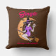 Un drôle d'oreiller avec une sorcière sur un balai tenant un crâne, et un croissant de lune et des chauves-souris dans l'arrière - plan. L'écriture amusante, "Single Ready to Haunt", est parfaite pour un cadeau de vacances d'Halloween pour une femme célibataire.