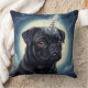 A stunning, digitally painted portrait featuring a stoic black pug transformed into the legendary Pug-nicorn. The artwork utilizes deep, rich blues and blacks contrasted with the warm amber glow of the eyes and the soft illumination of the moon and horn. The detailed fur texture and dreamlike, starry background make this a high-quality, eye-catching piece for any collector.