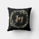 Ce magnifique coussin de vacances présente une couronne d'aquarelle festive de feuilles d'or, de verdure de Noël et de baies rouges sur un arrière - plan noir moderne. Le mot "joie" est présenté dans la calligraphie élégante, fausse or.
