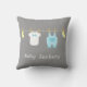 Un coussin mignon pour décorer la chambre à coucher et la crèche du bébé. Il a de mini vêtements et accessoires de bébé qui inclut les articles comme les chaussettes jaunes de bébé, une salopette blanche de bébé avec une cravate d'arc et les combinaisons bleues en pastel avec la poche accrochant sur une corde à linge avec les chevilles en bois. Grand pour célébrer la naissance des bébés. Les couleurs en pastel se tient juste sur l'arrière - plan gris et lui donne une élégance.