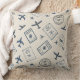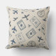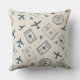 A classic seamless travel pattern throw pillow featuring detailed vintage airplanes, passport stamps, stars, and navigation symbols in deep navy blue on a textured parchment background. The retro aviation aesthetic evokes wanderlust, adventure, and old-world travel charm. Ideal for frequent travelers, aviation enthusiasts, and vintage design lovers. A thoughtful gift for pilots, travel lovers, and explorers—perfect for birthdays, retirement celebrations, travel milestones, or everyday inspiration.