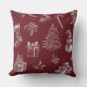 A seamless vintage Christmas toile pattern throw pillow featuring classic holiday motifs intricately illustrated white line art on a red background. The design includes Christmas stockings filled with gifts, wrapped presents with ribbons, holly branches with berries, snowmen, Christmas trees, and candy canes, all rendered in fine, hand-drawn detail. This nostalgic and elegant pattern evokes the charm of old-fashioned Christmases.