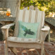 Ce coussin décoratif en tissu extérieur a un oiseau noir transparent volant contre un arrière - plan vert avec des feuilles et des toits d'arbre avec les ailes d'oiseaux étalées en vol à l'avant et à l'arrière.