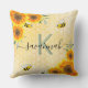 Un arrière - plan d'or avec un motif de nid d'abeilles et des abeilles souriantes joyeuses. Décoré de tournesols jaunes et oranges, de fleurs et de verdure. Personnalisez et votre nom et votre lettre monogramme. Le nom est écrit avec un script de style moderne et à grande main avec des swashes. Pour que les swashes ne suppriment que le nom de l'échantillon, laissez les espaces ou émoticônes devant et après le nom. Lettres noires et vertes.