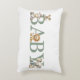 Cet oreiller personnalisé pour nurserie de bébé présente un thème neutre de genre de couleur vert sauge avec des illustrations d'animaux en peluche mignons. Le mot "BÉBÉ" est imprimé en lettres majuscules sur la partie supérieure. Les animaux en peluche accentuent la lettre. Un veau en peluche et une souris sont placés à gauche, avec un lionceau au centre. Un bébé éléphant et un canard sont placés à droite.