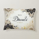 Diwali avec Elegant Floral & Diya Motif Accent Coussin Une célébration de la lumière et de la tradition, ce design personnalisable présente des motifs floraux en noir et or complexes à côté d'une lampe à huile radiante (diya) qui évoque la chaleur et l'illumination spirituelle. L'accueil festif est associé à une typographie gracieuse, créant un mélange harmonieux de richesse culturelle et de style raffiné. Parfait pour ajouter une touche personnelle aux expressions saisonnières de joie et de connexion.