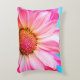 Une marguerite rose vif contre un arrière - plan bleu vif. L'arrière de la coussin est décoré d'un motif à points de polka couleur eau miroir.