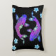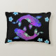 Poisson koi de style oriental violet, bleu et turquoise entouré de fleurs bleues sur un coussin noir.