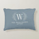 Ce coussin décoratif bleu et blanc est orné d'un monogramme de feuille de laurier, de votre nom et de la date de votre mariage. Un ajout cosy à votre décoration intérieure. Fait un excellent cadeau pour les mariages et les anniversaires. Personnalisez-le avec votre initiale, votre nom et la date de votre mariage. Disponible dans une variété de couleurs. Conçu pour vous par blackberry Boulevard.
