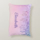 Coussin de chambre mignonne de fille avec parties scintillant arc-en-ciel faux gouttant contre un arrière - plan rose. Personnalisez avec son nom en écriture violette.
