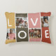 Créez votre propre coussin de collage photo avec ce modèle tendance. Le design comprend le mot LOVE, 4 rayures de couleur rétro avec des images carrés, le nom de famille, la date et des mots significatifs.