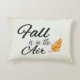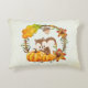 devant le coussin avec un mignon écureuil debout derrière quelques citrouilles orange aquarelle. Une couronne de feuillage les entoure d'une feuille de chêne et de fleurs d'orange et d'autres sprigs et feuilles. Le dos du coussin a un design typographique qui dit que Fall est dans l'air. L'Arrière - plan derrière l'image est une image de parchemin imitation vintage couleur crème, avec un aspect vieillot rugueux autour des bords.