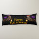 Double the magic and double the cuteness with this magical twin witch kittens Halloween body pillow this extra long decorative cushion features two adorable tabby kittens and purple which hats and capes soaring toward the centre on their broomsticks with glowing lanterns perfectly balanced with a bold vintage style happy Halloween greeting in the middle this high detail illustration is set against a deep black background from maximum pop whether you're decorating a guest room a nursery or your own sofa. This whimsical feline design brings a cozy enchanted touch to your haunt season home decor