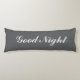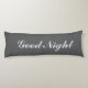 Grey body pillow with custom text. Good Night. Personalized with custom text or name. Elegant script typography. Long shape bedroom cushion for sleeping and hugging.