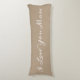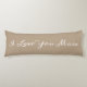 Les deux côtés du coussin corporel sont conçus avec du beige clair. La face avant a "I Love You More" en caractères de caractères en caractères blancs.