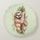 Un coussin rond avec un design d'aquarelle mignon avec un paresseux mignon accroché à une branche d'arbre entouré de feuilles tropicaux verts. Arrière - plan vert olive clair.