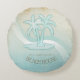 Cet oreiller rond jeté dans les couleurs douces de la mer et du sable vous permet d'ajouter facilement votre propre nom et texte en utilisant la modèle fournie. L'image simple des palmiers sur un arrière - plan en difficulté, aquarelle, est mise en valeur par un accent de vague dans l'eau et le blanc. Recherchez ID623 pour voir la coordination des éléments balnéaires et des produits supplémentaires avec cette conception.