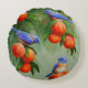 Deux bleuets de l'ouest perchent dans un pêcher tandis qu'un troisième bleu est assis sur un panier en bois tressé rempli de fruits frais récoltés prêts à être commercialisés.
