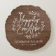 Conception de coussin rond en bois sombre imprimé rustique pour cadeau de mariage qui comporte les mots "happily ever after" en écriture unique encerclés de feuilles de laurier simples avec les noms et dates de mariage pour que vous puissiez personnaliser.