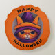 Chat orange avec sorcière violette Casquette Joyeux Coussin rond Halloween. Dessin d'un mignon chat orange avec un casquette violet et orange. Joyeux texte noir Halloween sur un arrière - plan orange.