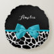 Un coussin rond à rayures de girafes noir et blanc chic avec un ruban bleu aqua branché dans un arc girly. Personnalisez ce dessin animal mignon en ajoutant votre nom. A l'envers, on retrouve un motif de girafe design. Image imprimée plate, pas l'arc réel.