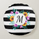 Coussin ronde élégante avec couronne d'aquarelle fleurie sur arrière - plan rayé noir & blanc. Customisez le monogramme en choisissant parmi de nombreuses polices merveilleuses.
