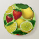 Un oreiller rond vibrant présentant des citrons, des limes et des fraises lumineux dans un style botanique frais sur un fond vert doux. La palette joyeuse et estivale ajoute un accent vivant aux salons, chambres et espaces de lecture cosy. Un choix élégant pour les femmes qui aiment les motifs fruitiers, la décoration colorée et les accessoires de maison prêts à offrir.