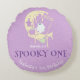 Le coussin d'Halloween a présenté une lune jaune pâle éffrayante avec un arrière - plan violet et un mignon fantôme éffrayant portant un casquette sorcier et un ami de hibou. Parfait pour une gentillesse éffrayante Boo ! Personnalisez le nom de votre petite fille pour une soirée Spooktacular Halloween 1er anniversaire.