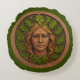 Une Femme Verte sculptée dans le bois avec de la peinture appliquée aux feuilles de chêne et cheveux. Customisez en ajoutant votre propre texte à l'envers. Également connu comme tête de feuillage, le Green Man/Wild Man, est un motif d'architecture et d'art, un visage composé ou complètement entouré de feuillage, le plus souvent s'étalant du centre du visage. Outre une fonction purement décorative, l'homme vert est interprété comme un symbole de renaissance, représentant le cycle de la nouvelle croissance qui se produit chaque printemps. Trouvé dans de nombreuses cultures de plusieurs âges à travers le monde, l'Homme Vert est souvent apparenté à des divinités de végétation naturelle. L'équivalent féminin de l'Homme Vert est souvent appelé la Femme Verte ou la Sheela-Na-Gig. Ces personnages, souvent représentés avec une couronne feuillue ou des cheveux luxuriants, symbolisant son lien avec le monde naturel, sont associés à la fertilité, la nature et la nature sauvage. Dans certains contextes, la "Femme sauvage" ou le "Glaistig" (un esprit marin dans le folklore écossais) peuvent également être considérés comme des équivalents féminins de l'Homme vert, représentant différents aspects de la sauvagerie et du pouvoir de la nature.