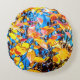 Feuilles d'automne colorées de couleur orange et jaune contre l'arrière - plan bleu et gris. Belle et positive scène florale d'automne. Coussin rond pour n'importe qui.