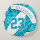 Ce coussin de volley-ball féminin personnalisé présente un graphique de volley-ball bleu et blanc turquoise qui a un motif kaléidoscopique floral girly mélangé avec des panneaux de volley bleu et un motif tourbillon abstrait mélangé avec des panneaux blancs - son nom et son numéro de maillot sont personnalisables dans la coordination bleu turquoise - par katz_d_zynes