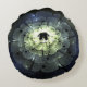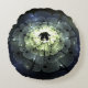 Cet abstrait coussin rond présente une fleur fractale 3D foncée avec des pétales jaunes et des points noirs.