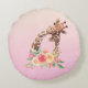 Un oreiller rond avec un dessin mignon en aquarelle d'une girafe maman et bébé. La girafe mère pose sa tête sur la girafe bébé, adorable et affectueuse. Joli bouquet de fleurs aquarelles rose, jaune et vert placé sous ce couple charmant. Un fond dégradé créé en utilisant une couleur rose doux se fondant dans une couleur orange pêche clair.